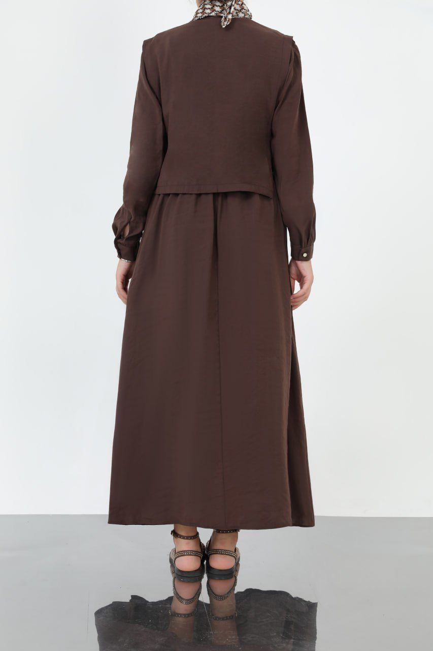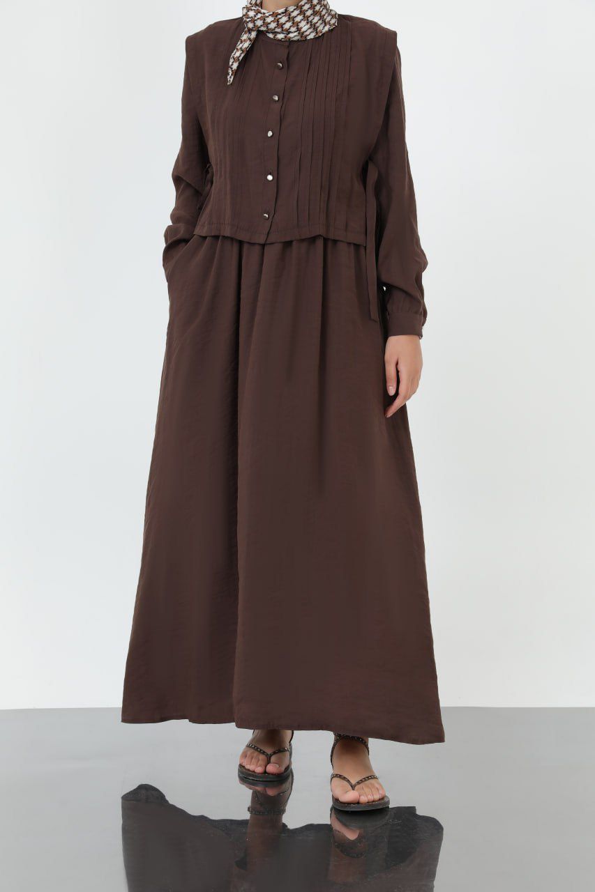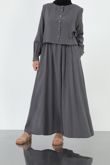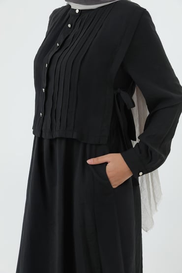 Modern dokunuşlarla tasarlanmış bu pile detaylı düğmeli elbise, gündelik şıklıkla zarafeti buluşturuyor. Dik yaka kesimi, ön yüzündeki zarif pileler ve sedef düğmeler ile sade ama güçlü bir stil sunar. Viskon karışımlı kumaşı sayesinde dökümlü yapısı ve hafifliği ile gün boyu konfor sağlar.